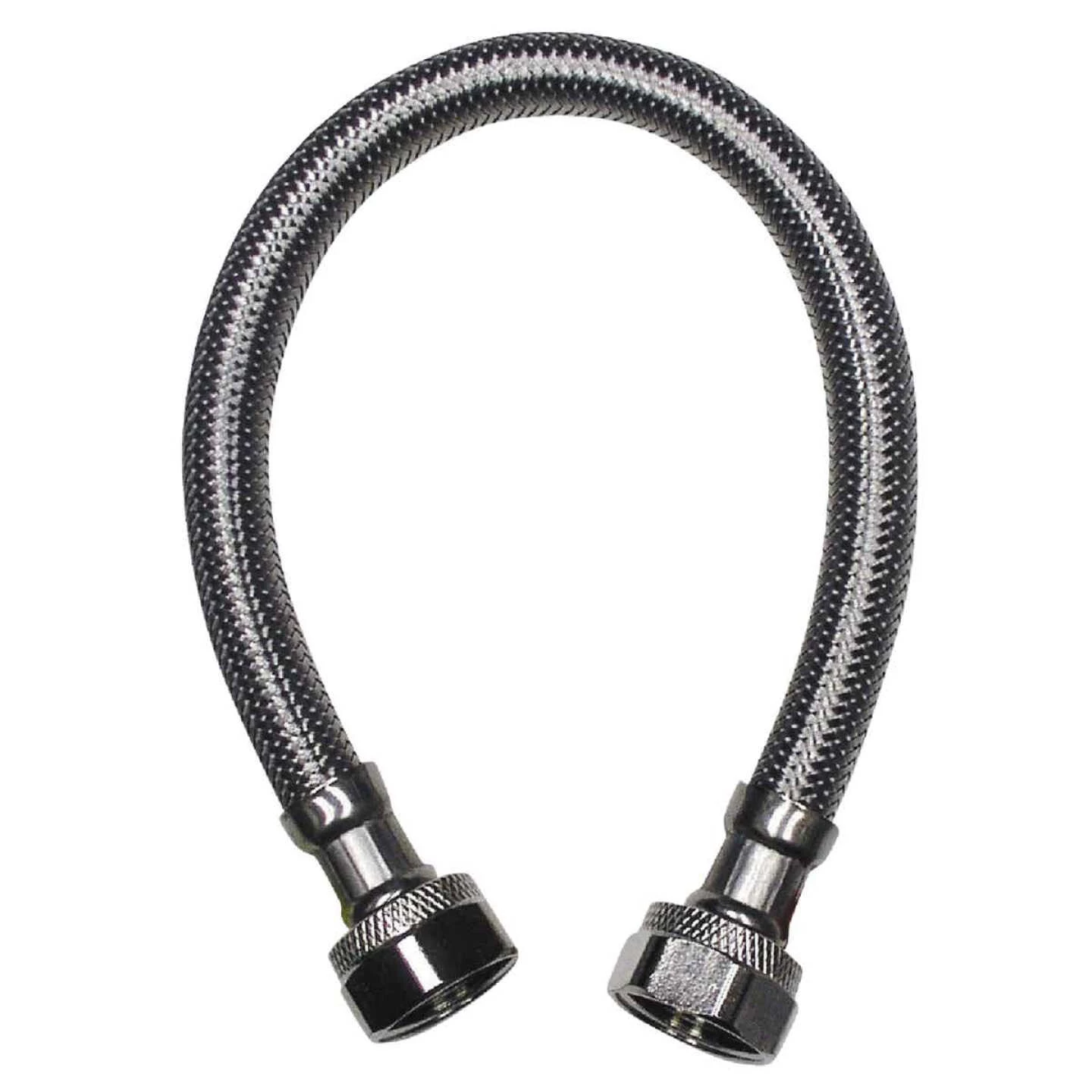 1/2 In. x 1/2 In. faucet connector. Braided stainless steel wrapped around reinforced braided PVC with brass hex connector nuts. Approved for residential, commercial, and industrial applications for water supply connections to fixtures. Core is Virgin PVC with polyester yarn braiding over-braided with stainless steel 304 for strength and durability, chrome-plated brass nuts, and washers for a dependable hand-tight seal. Max Temp 180 F (degree Fahrenheit). Max Pressure: 125 psi (pounds per square inch) IAPMO (International Association of Plumbing and Mechanical Officials) listed.