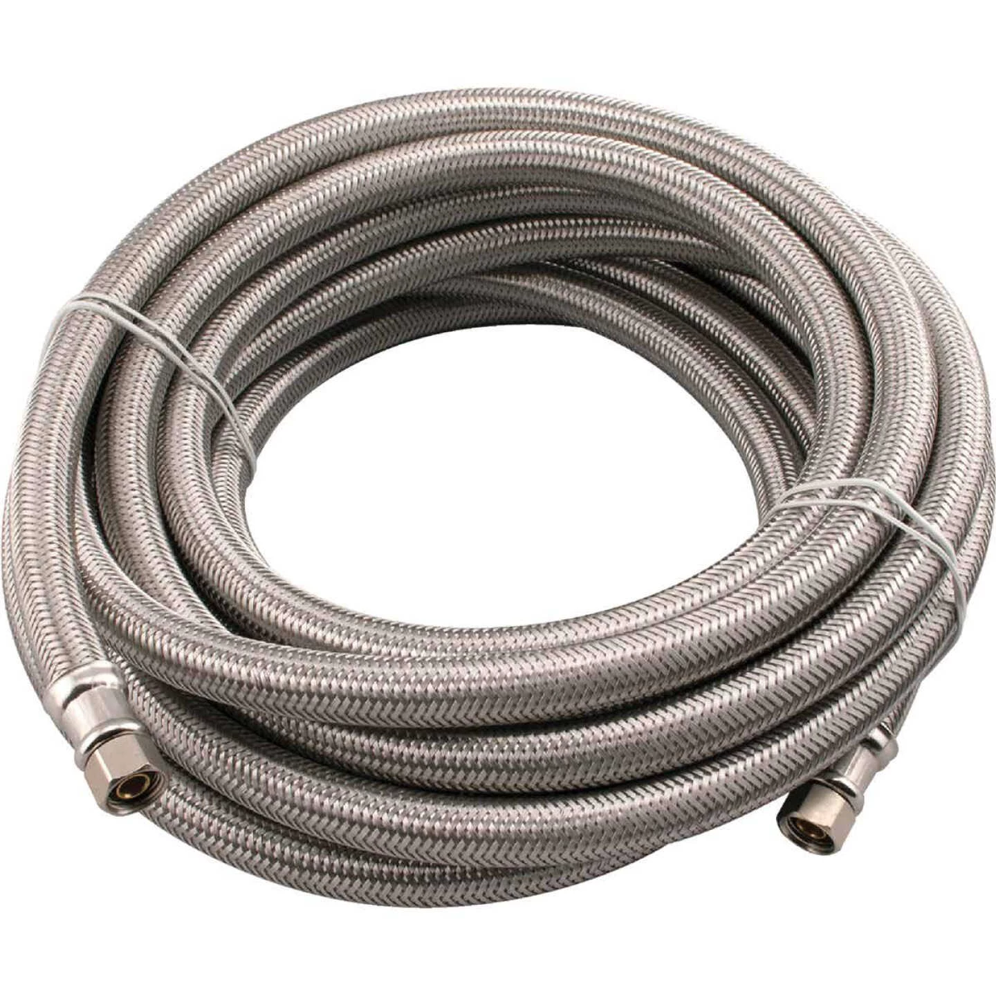 1/4″ x 1/4″ ice maker connector. Braided stainless steel wrapped around reinforced braided PVC with brass hex connector nuts. Approved for residential, commercial, and industrial applications for water supply connections to fixtures. Core is Virgin PVC with polyester yarn braiding over-braided with stainless steel 304 for strength and durability. Chrome-plated brass nuts, and washers for a dependable hand-tight seal. Max Temp 180 F (degree Fahrenheit). Max Pressure: 125 psi (pounds per square inch). IAPMO (International Association of Plumbing and Mechanical Officials) listed.