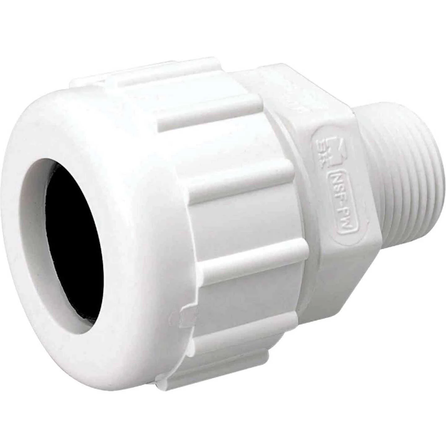 Male pipe thread on 1 end with compression fit on the other. Will fit Schedule 40 cold water iron or PVC pipe. Import.