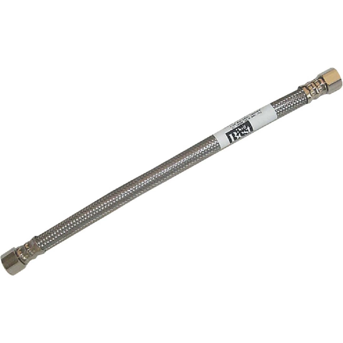 Durable faucet connector. Braided stainless steel wrapped around reinforced braided PVC with brass hex connector nuts. Approved for residential, commercial, and industrial applications for water supply connections to fixtures. Core is Virgin PVC with polyester yarn braiding over-braided with stainless steel 304 for strength and durability. Chrome-plated brass nuts, and washers for a dependable hand-tight seal. Max Temp 180 F (degree Fahrenheit). Max Pressure: 125 psi (pounds per square inch). IAPMO (International Association of Plumbing and Mechanical Officials) listed.
