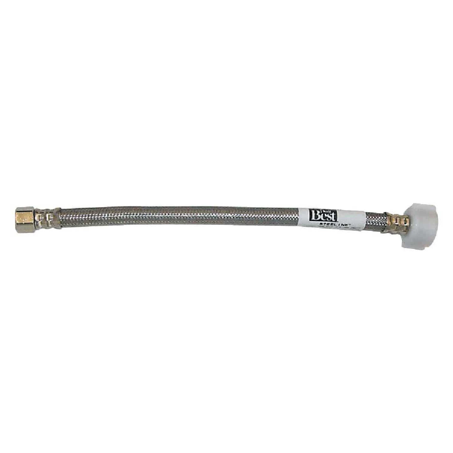 Braided stainless steel wrapped around reinforced braided PVC with brass hex connector nuts. Approved for residential, commercial, and industrial applications for water supply connections to fixtures. Core is Virgin PVC with polyester yarn braiding over-braided with stainless steel 304 for strength and durability. Chrome-plated brass nuts, and washers for a dependable hand-tight seal. Max Temp: 180 F (degree Fahrenheit); Max Pressure: 125 psi (pounds per square in). IAPMO (International Association of Plumbing and Mechanical Officials) listed.