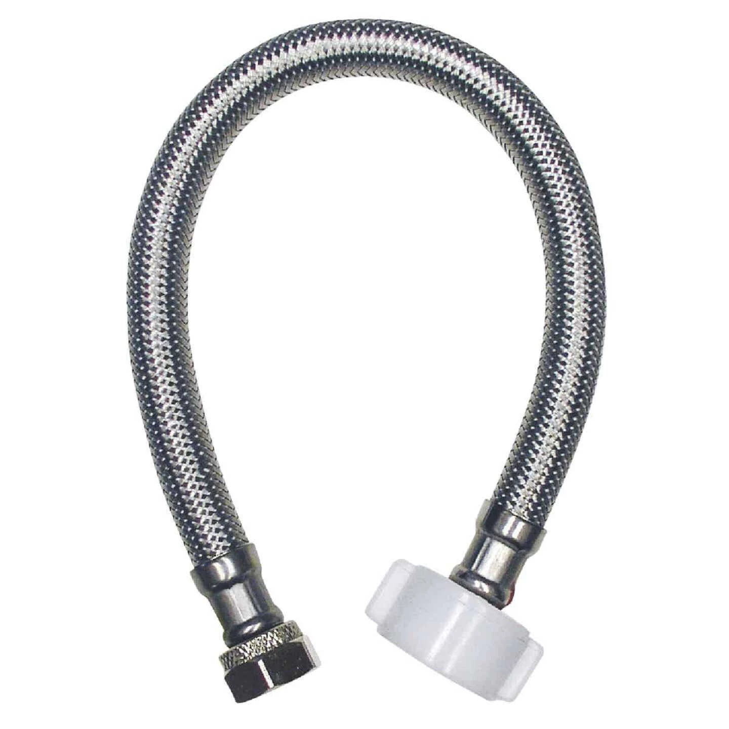 - Braided stainless steel wrapped around reinforced braided PVC with brass hex connector nuts