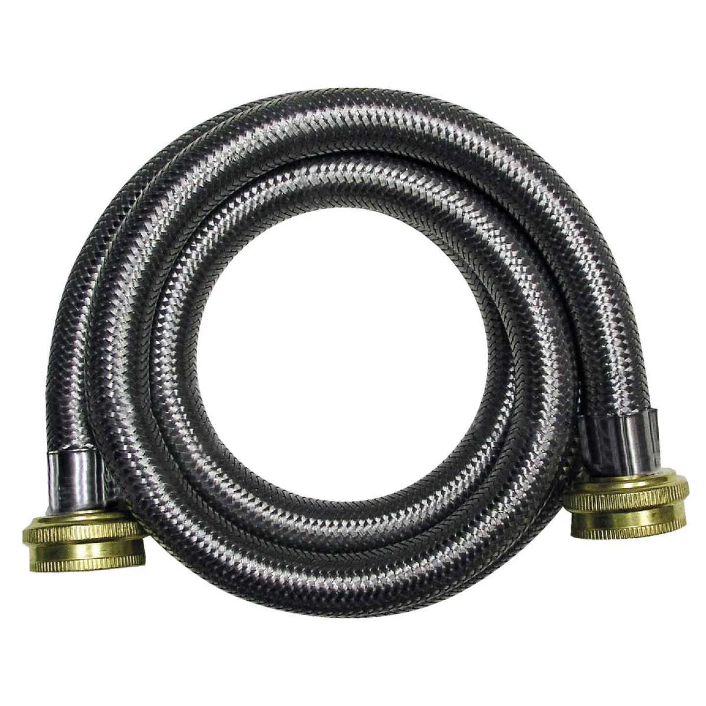 3/4″ x 3/4″ washing machine connector. Braided stainless steel wrapped around reinforced braided PVC with brass hex connector nuts. Approved for residential, commercial, and industrial applications for water supply connections to fixtures. Core is Virgin PVC with polyester yarn braiding over-braided with stainless steel 304 for strength and durability. Chrome-plated brass nuts and washers for a dependable hand-tight seal. Max Temp: 180 F (degrees Fahrenheit); Max Pressure: 125 psi (pounds per square inch. IAPMO (International Association of Plumbing and Mechanical Officials) listed.